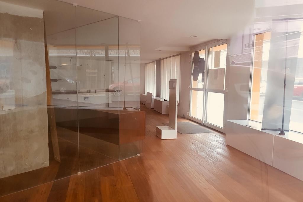 LA BAULE Centre, entre la Gare et l'Avenue du Général de Gaulle, Local commercial aménagé d'une surface de 95 m² avec linéaire vitrine de 20 ml : surface de vente de 90 m², Sanitaire WC de 5 m² et 2 places de parking extérieures privatives : local exploité depuis 2012 dans le cadre d'une activité de conseil et vente de produits audiovisuels haut de gamme. Agencement de qualité et moderne, sol en parquet massif, plafond avec spots intégrés.